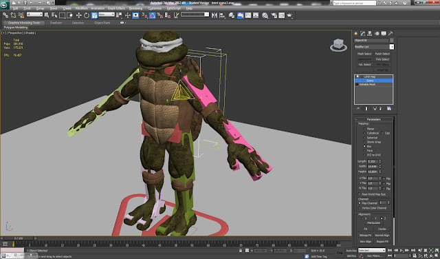 I started rigging the models, i was worried that , because of the Turtles high polly count, that adding bones and a skin modifier may go horribly wrong, and if it had done, my back up plan was to rig him like the robots on the previous project, just using IK chains, which would have looked awful on a character that is meant to have moving skin. Luckily this wasn't the case and the rig worked for both characters, after some faffing with the envelopes.